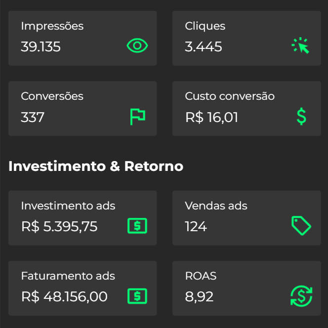 Este resultado de vendas e faturamento foi conquistado por um de nossos clientes, por meio da nossa gestão de anúncios no Google Ads.